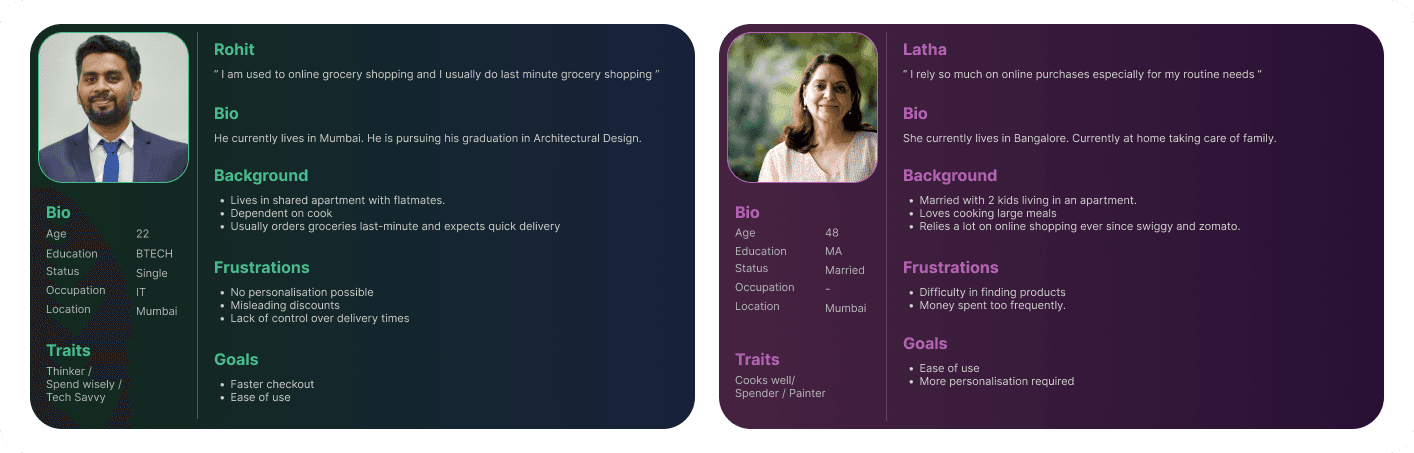 After understanding the problem, Next step was to identify a target user examining the flow of quick commerce application which includes the home screen, search, category page, product listing page, product detail page and finally to the cart and redesign the flow while identifying the opportunities to make usability better for the people aged between 16-55 years which will lead to increased customer retention and boost average order value.